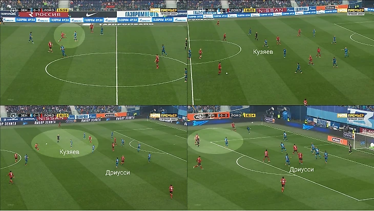 Против «Локо» Семак группировал «Зенит» в центре через игру Малкома и Дриусси параллельно штрафной. Сужение пространства сильно помогало Барриосу и Кузяеву – опорные полузащитники легко перекусывали движение Жемалетдинова и контролировали подачи с флангов.