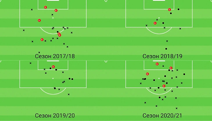 На графике – зоны, из которых бьет Кузяев. Главное наблюдение: в этом сезоне Кузяев постоянно наносит удары из штрафной, причем почти всегда – в одно-два касания после вертикальных передач или скидок на свободное пространство. Кузяев практически не бьет из неподготовленных позиций, когда защитникам проще блокировать удары.