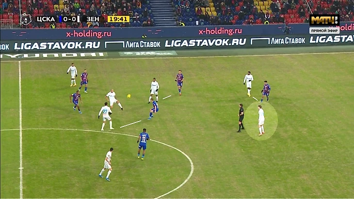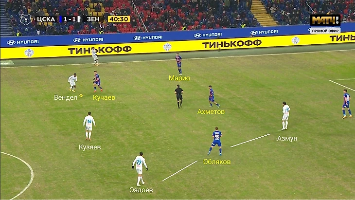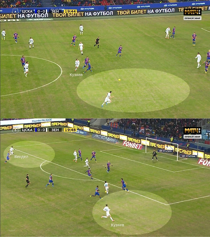 В итоге Кузяев немного затормозил и отдал на Оздоева. Но цель была достигнута: ЦСКА сгруппировался в центре, оголив фланги из-за смещения Кучаева и Эджуке к эпизоду. «Зенит» удачно расставился: Вендел и Кузяев растягивали Облякова и Ахметова, а в это пространство ворвался Оздоев. Так «Зенит» организовал пенальти.