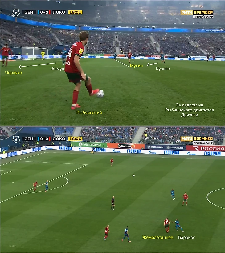 Вот общий пример: Кузяев атаковал Крыховяка, выключив быстрый переход «Локо», и сразу занял позицию в паре с Барриосом. Через несколько секунд мяч вернулся к поляку, но снова включился Далер (страховали Барриос и Малком). Так атака была направлена на фланг.
