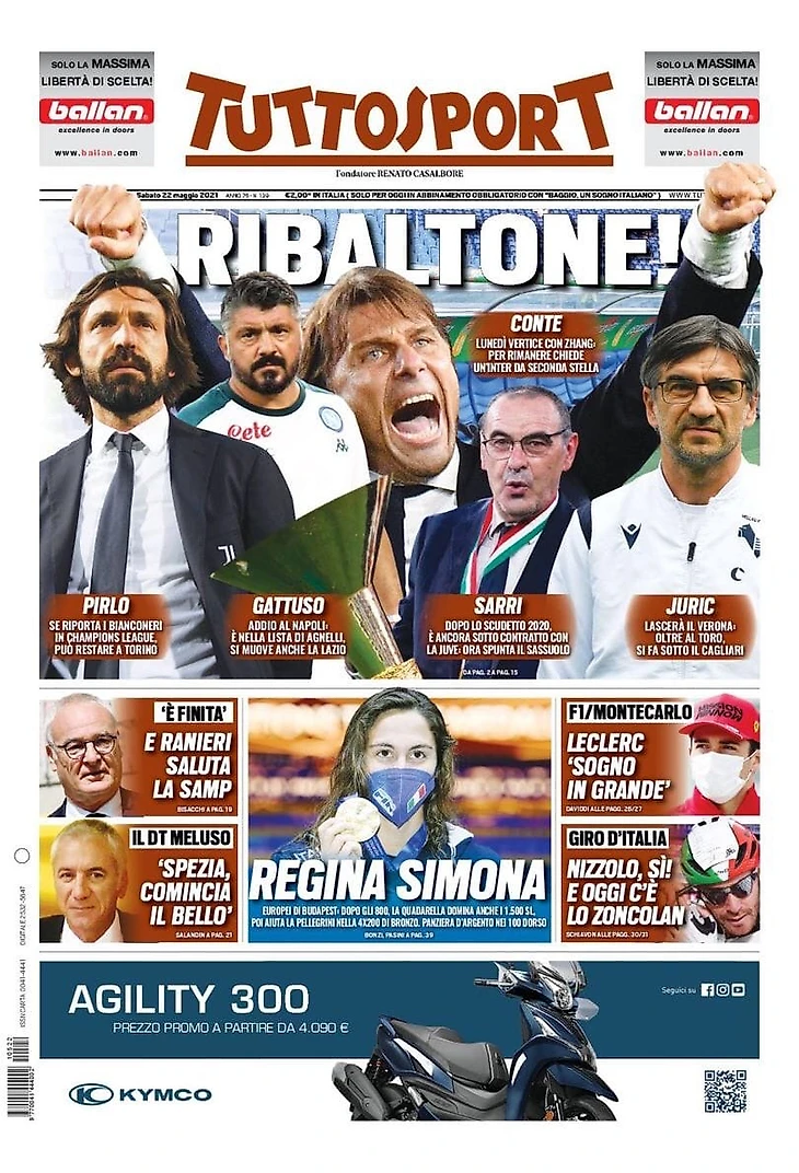 Конте, в понедельник встреча с Чжэном: чтобы остаться, он просит «Интер», достойный второй звезды. Если Пирло выведет Бьянконери в Лигу Чемпионов, он может остаться в Турине. Гаттузо, прощание с «Наполи»: он в списке Аньелли, есть подвижки также от «Лацио». Сарри после Скудетто-2020 всё ещё на контракте с «Юве»: теперь проверка «Сассуоло». Юрич покинет «Верону»: помимо «Торино», на него нацеливается «Кальяри».
