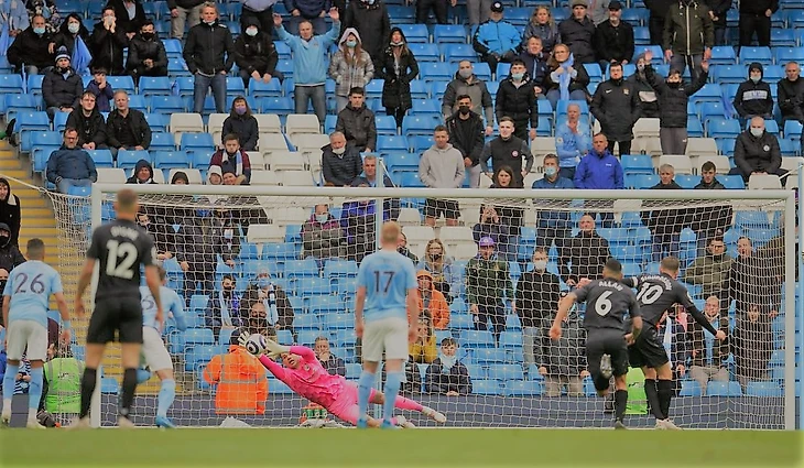 Казалось бы 2-0, Сити не в меньшинстве, но всё равно срабатывает усыпляющий эффект голевого преимущества. И Зинченко отдаёт обратный пас не то Эдерсону, не то Стоунсу, но за мячом убегает Ришарлисон, а Диас вынужден косить его в штрафной. В итоге португалец отделался жёлтой картой, а Сити - пенальти. Бьёт Сигурдсон и... не забивает! Эдерсон вытаскивает пенальти и делает свою золотую перчатку платиновой!
