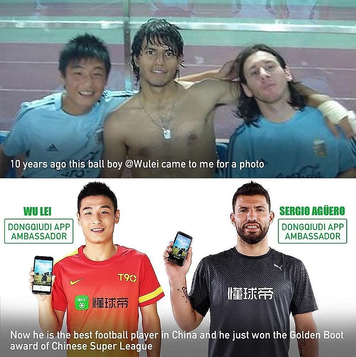 У Агуэро и Месси с того турнира осталось фото с самим Ву Лэем. Тогда он был просто болбоем, а сейчас стал футболистом «Эспаньола» и главной звездой китайского футбола.