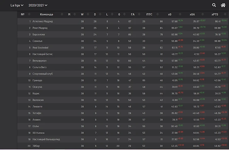 В этом и заключается класс игроков и команды, когда она выжимает больше, чем может. Если мы посмотрим на ту же самую «Барселону» прошлых сезонов, то увидим, что в прошлых сезонах команда набирала в реальности больше, чем наиграла. В сезоне 2019/2020 команда набрала 82 очка при должных 73, в сезоне 2018/2019 в активе было 87 очков при должных 74, а в сезоне 2017/2018 команда в реальности набрала 93 очка, а должна была набрать 79. В этом сезоне команда стала чемпионом, опередив «Реал» на 17 очков . А если посмотреть на таблицу ожидаемых очков, то «королевский» клуб должен был набрать на одно очко больше, и становится чемпионом.