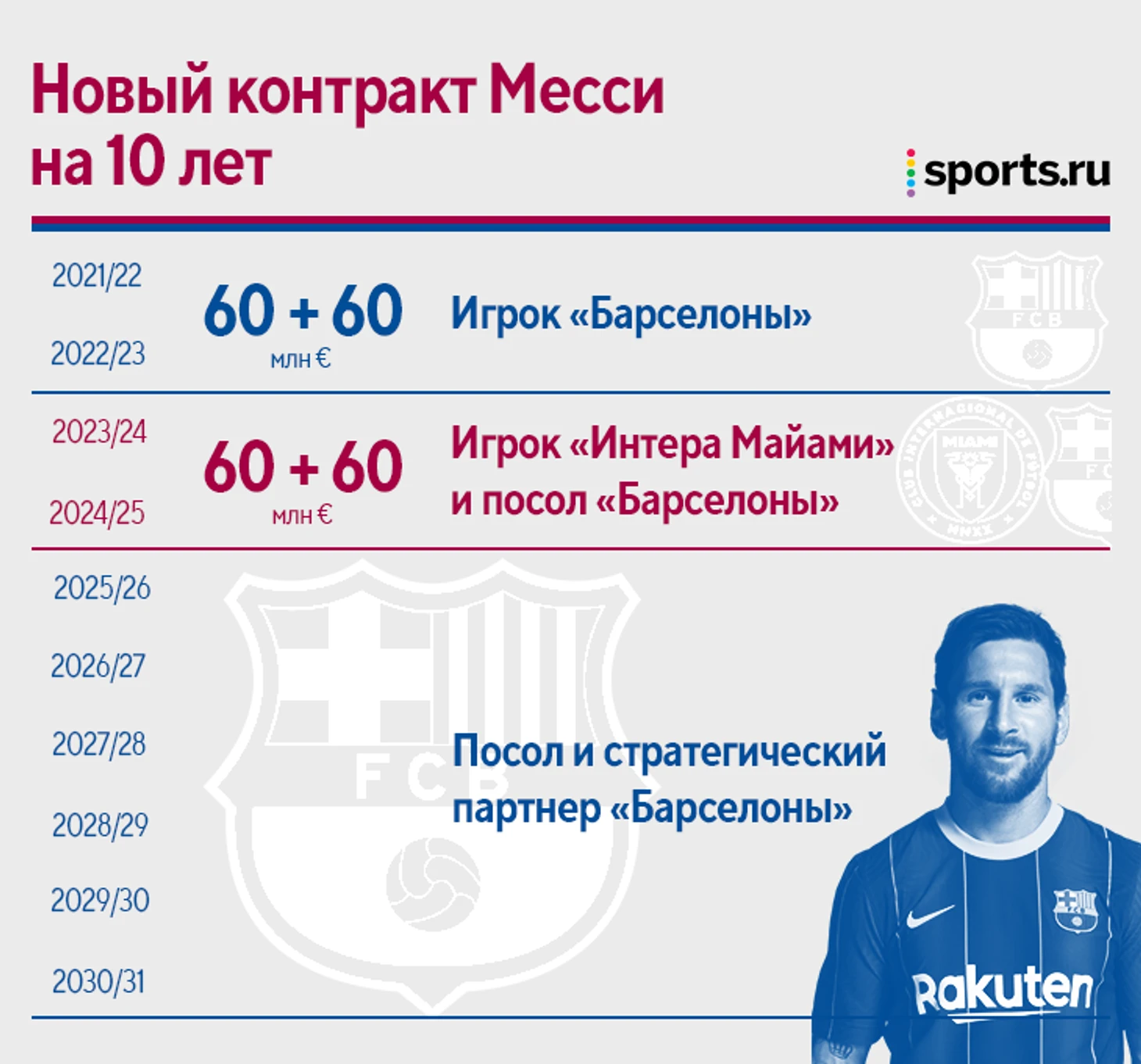 Предполагается, что следующие два года Месси проведет в «Барселоне», потом уедет на два года в «Интер Майами» в МЛС, но сохранит контракт с «Барселоной» (станет послом клуба в США и будет продвигать «Барсу» в испаноязычной Флориде). Почему «Интер»? «Барса» близка к сотрудничеству с американским клубом.
