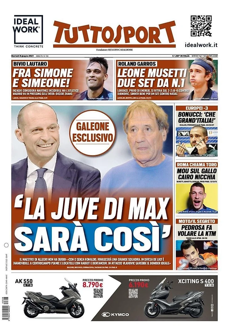 Эксклюзив с Галеоне. Учитель Аллегри не имеет сомнений: «Без Роналду или с ним, возродится великая команда. В обороне Де Лигт незаменим, в полузащите Пьянич и Локателли с Рабьо и Бентанкуром. В атаке Влахович будет идеальным бомбардиром».