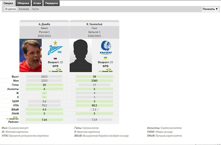 Видно, что Роман Яремчук хуже Артёма Дзюбы в верховых единоборствах, но он больше бьёт в среднем ударов за мяч и лучше контактирует с партнёрами, обыгрываясь и создавая для них голевые моменты. Процент успешности передач 80.2% против 70.2%. Вообще реализация голевых моментов форварда Украины - это одна из самых больших проблем сборной.