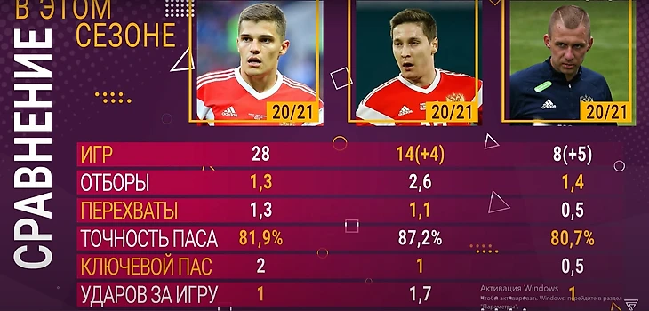 Александр Головин - главная звезда. Потрясающий сезон (5+9). В среднем 1,7 ключевых пасса за игру и 1.5 кросса. В обороне если же забыть о существовании Семёнова и погрустить травме Кудряшова (которую он получил в последнем товарищеском матче) в пару с Джикией можно спокойно ставить Игоря Дивеева 1.7 перехватов, 4.5 выносов, 6 длинных передач за матч (в условии столба Дзюбы - это неплохая опция в атаке). 3.3 выигранных отборов. Верховую борьбу против Лукаку он может быть и не выиграет, но для 21-летнего центбека, его цифры и игра на поле впечатляет. Нельзя забывать и о правом фланге обороны, который начисто забетонирован Марио Фернандесом. Все мы прекрасно помним какой перфоманс натурализованный бразилец исполнял на Чемпионате Мира в России. И с такого момента он не капли не сбавил в своих показателях. Тем более с проблемным левым флангом обороны - Фернандес это элемент стабильности в такой сборной России. Черышев - это истина в последней инстанции и его появление в стартовом составе вызвано разве, что только тем, что он на хорошем счету у Черчесова. А вот справа, я могу предположить, что против той же Дании или Финляндии может выйти Ионов, а Миранчук всего лишь будет как опция с замены. И это будет большая ошибка. Пара Миранчук - Головин единственные кто в атаке сборной России могут давать движение и снабжать Дзюбу мячами.