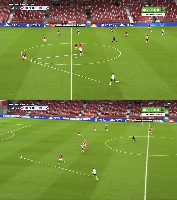 Дальше Карраско немного закопался, но Бельгия все равно сохранила классные вводные: во-первых, при контратаке многие бросили позиции, датчане в хаотичном расположении; во-вторых, Кастань и Витцель умышленно вбегали между полузащитниками Дании, что создало Бельгии коридоры для второго темпа.