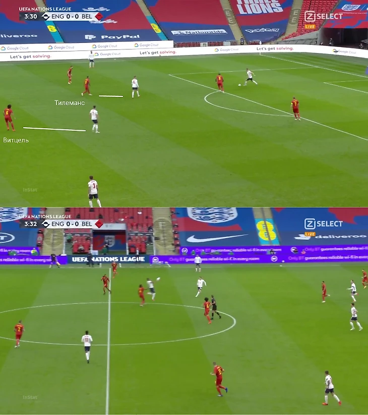 Бельгия прессингует в 5-2-3, где защитники поднимались к английским латералям, а Витцель и Тилеманс до упора зеркалили Райса и Хендерсона. Англия максимально выманивала Бельгию в прессинг, чтобы Тоби-Денайер-Вертонген оторвались от партнеров.