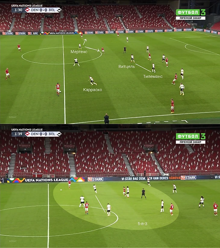 Оставаясь в центре, Карраско и Мертенс ориентировались на игроков, продвигающих мяч через полуфланги. При передаче на фланг Бельгия перетекла за мячом: датчанина встретил Мертенс, а под него адаптировались Витцель, Тилеманс и Карраско – так они зажали Данию на фланге, получив численное преимущество. Это базовая и простая вещь, но она очень хорошо отлажена.