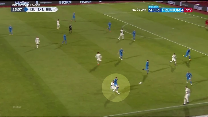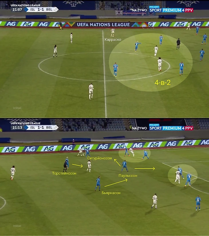 Здесь всех попытался растащить Карраско: поднялся высоко, чтобы получить мяч без давления. Но Исландия адаптировалась: по Доку играл латераль Сайварссон, а к Яннику выдвинулся ЦПЗ Сигурйонссон. Чтобы оборонительная структура не сломалась, ему помог форвард Торстейнссон, плюс к эпизоду сместился опорник Паульссон. Так Исландия получила численное преимущество в эпизоде без потери качества: Лукаку держали двое, Карраско – тоже, плюс был резерв в виде Паульссона и Бьярнасона. Розыгрыш закончился неудачным навесом.