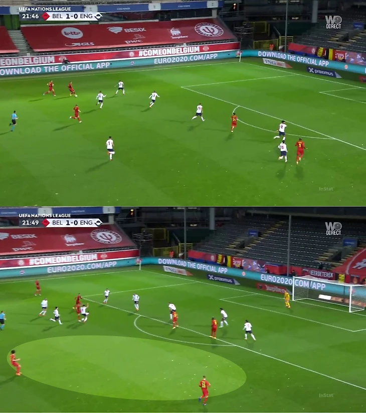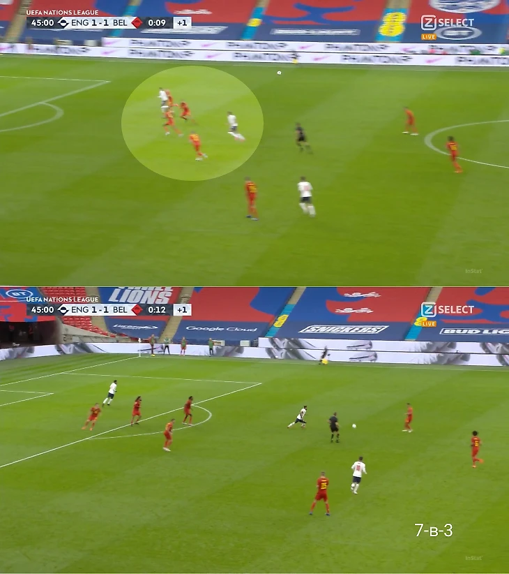 Еще один пример другой проблемы опорной зоны Бельгии. Во втором тайме на «Уэмбли» Мартинес перешел на агрессивный персональный прессинг. Англия этим пользовалась и уводила Витцеля и Тилеманса максимально высоко. В этом эпизоде бельгийская оборона ошиблась: два игрока бросились на Кэлверта, поэтому он скинул мяч на свободного Рэшфорда. Но важно другое: Льюин пробивал из хорошей позиции, так как опорная зона Бельгии не успела вернуться.