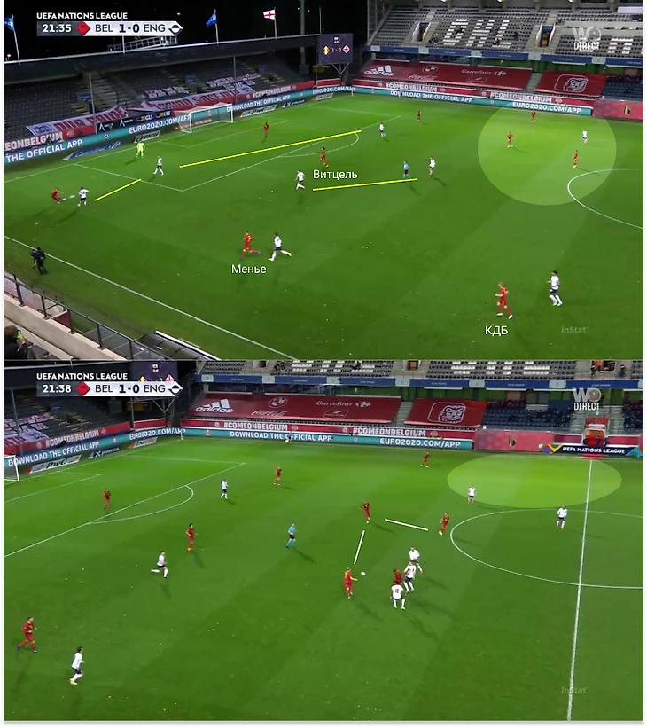 В матче против Англии был отличный пример, как Бельгия работает позиционно. В этом эпизоде тройка защитников расставилась широко, а Витцель и Тилеманс – за спинами прессингующей тройки. В первой фазе численного превосходства не получилось, но выручили остальные: Менье высоко увел Чилуэлла, а Райс и Хендерсон пытались перекрыть центр. Тоби нашел Лукаку, под которого открылись сразу несколько игроков. Здесь интеллектуально сработал Де Брюйне: он увел крайнего центрального защитника Мингза за собой, а затем отыграл его дополнительным движением под Лукаку.