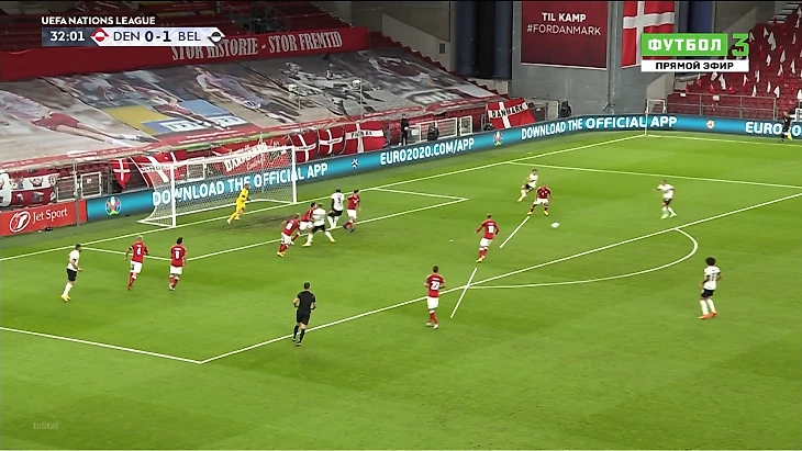 Теперь пример работы вторым темпом – из матча с Данией. Бельгия снова убежала вперед тройкой. Карраско и Азар в удобной ситуации – против них один защитник, два – позади, плюс есть свободная зона.