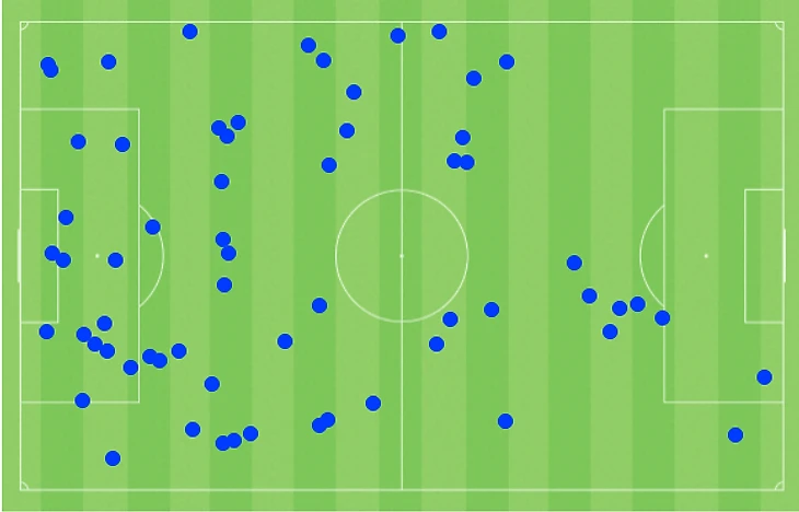 Саутгейт практически игнорировал центр, растаскивая своих полузащитников по флангам. Еще он исключил подключения центральных защитников через середину – возможно, опасаясь контратак. Поэтому Англия часто забрасывала мяч вперед, а Бельгия давила количеством. Вот карта подборов Бельгии в первом тайме (ее ворота – слева):