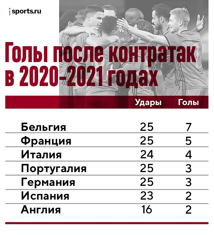 В 2020-м и 2021-м Бельгия провела 11 матчей и довела 25 контратакующих прорывов до ударов, 7 из них закончились голами. Бельгия – лучшая сборная Европы по этому показателю.