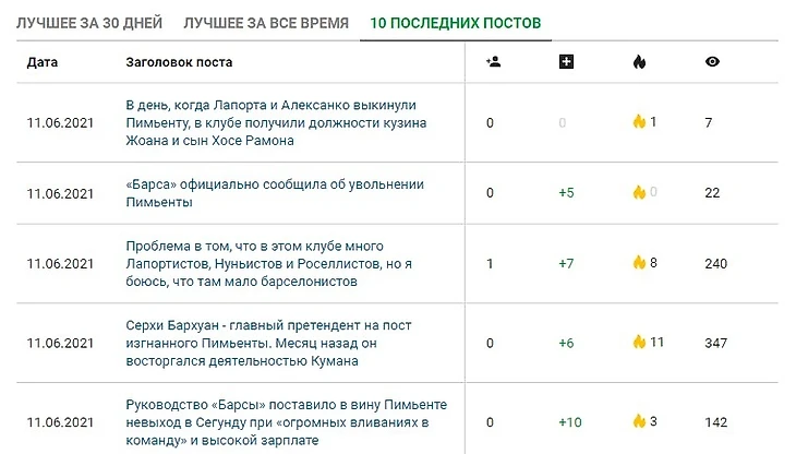 Как вам такая ситуация? На первом скриншоте запечатлено наблюдение статистики 11 июня в 22:27, на втором - 12 июня в 14:52. За 16 с половиной часов публикация с названием «Барса» официально сообщила об увольнении Пимьенты» прошла путь от +5 (+5-0) и 22 просмотров до +1 (+1-0) и 28 просмотров, публикация «Серхи Бархуан - главный претендент на пост изгнанного Пимьенты. Месяц назад он восторгался деятельностью Кумана» прошла путь от +6 (+6-0) и 347 просмотров до +5 (+5-0) и 1627 просмотров [в списке моих публикаций рейтинг этой записи отображается как +5-1]. Просто в системе счисления Спортса следом за 4 следует 6, после идут 5 и 1. Особенно умилительно было видеть вечером +5 у публикации об официальном изгнании Пими в приложении (раздел блоги-> подписки) и на своей странице на сайте в последних записях, но в лентах «Барселоны» видеть запись только в категории «Все» с рейтингом +1, отсекающим ее от основной публики.