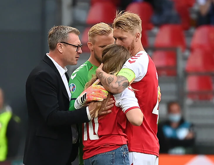 Образцовые действия партнеров Эриксена: Кьер подлетел проверить язык и с Дилэйни организовал живую стену, Шмейхель помогал утешить жену