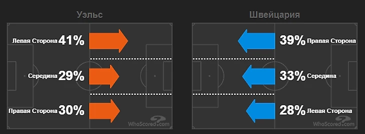 Единственный гол от Швейцарии забил Брель Эмболо ( игрок Боруссия М. ) с передачи Джердана Шакири ( игрок Ливерпуля ). На Эмболо стоит обратить отдельное внимание, он идеально вписывается в игру Швейцарии и имеет шикарную технику, с помощью которой Брель сделал за игру несколько сольных проходов, один из которых закончился шикарным ударом, но был отражён вратарём Уэльса. При этом забил Эмболо всё же после подачи углового.