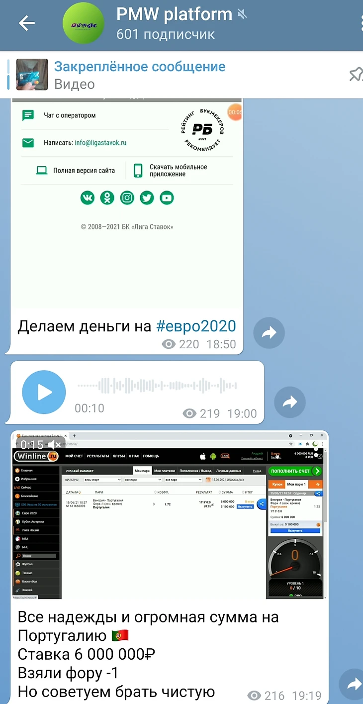 Сегодня в одной из букмекерских контор в России, сделана самая крупная ставка на ЕВРО2020. Больше данной суммы не ставили даже на матч Испания-Швеция, где как казалось ,все любители ставок, отметились ставкой на Испанию 🤷♂️, кстати данный матч многие игроки будут помнить долго)) . На телеграмм канале сервиса PMW (сервис специализируется на поиске крупных ставок и собирает информацию со всех бк России. ) была выложена пока крупнейшая ставка в России на ЕВРО2020, некто поставил 6 000 000₽ на победу Португальцев в матче с Венграми.