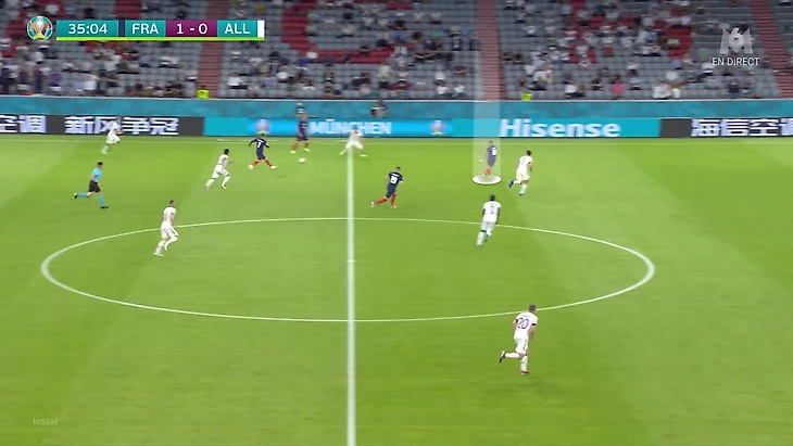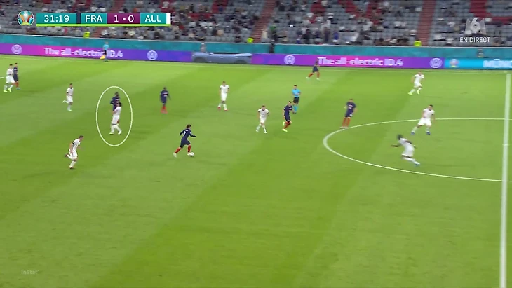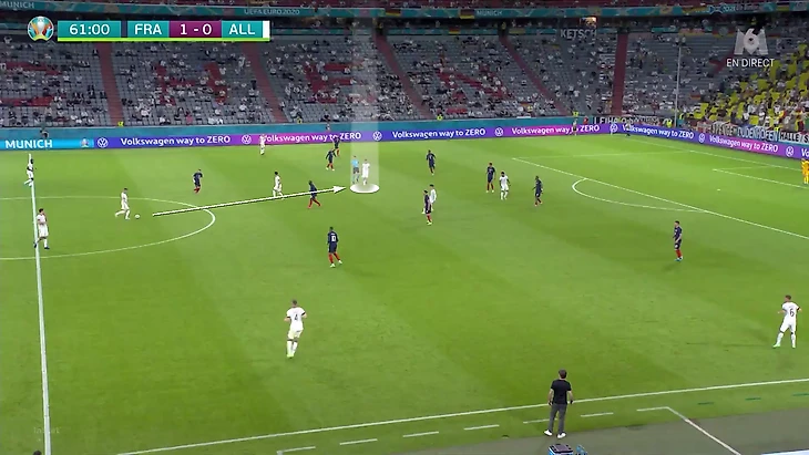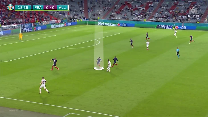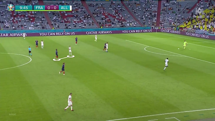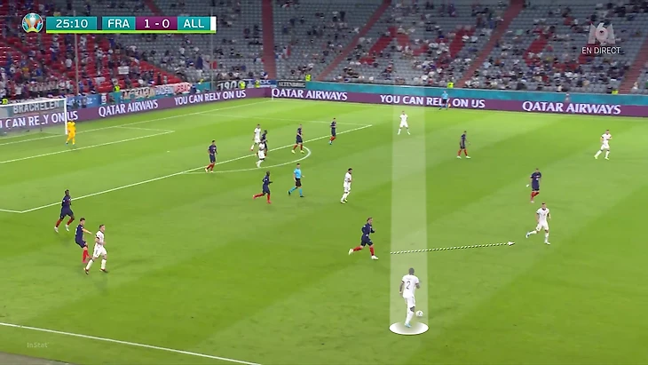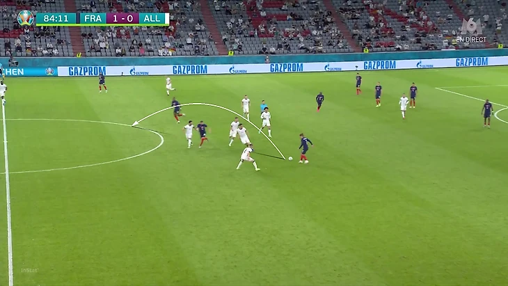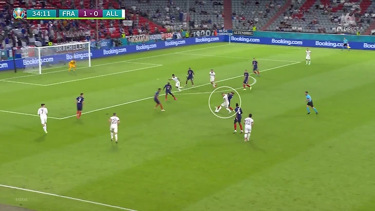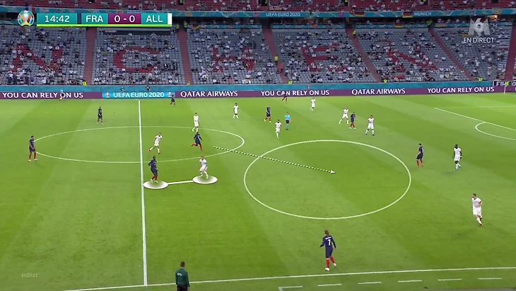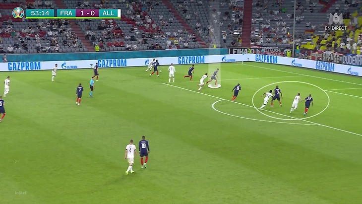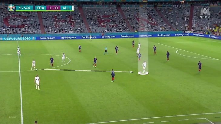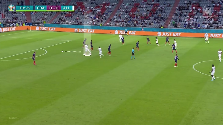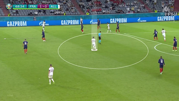 По итогам первого тура Евро у Франции худший результат по прессинг-действиям. В теории у Франции были условия, чтобы сыграть рискованнее без мяча. У Германии вышла тройка центральных защитников, у французов – тройка нападающих. В случае высокого прессинга у команды Лева не было бы лишнего игрока в первой стадии. Вместо этого Дешам выбрал более осторожный, но при этом и более оригинальный вариант (в этом чуть ли не весь Дидье!). Гости осознанно опекали Тони Крооса – пожалуй, самого важного в розыгрыше у Германии.