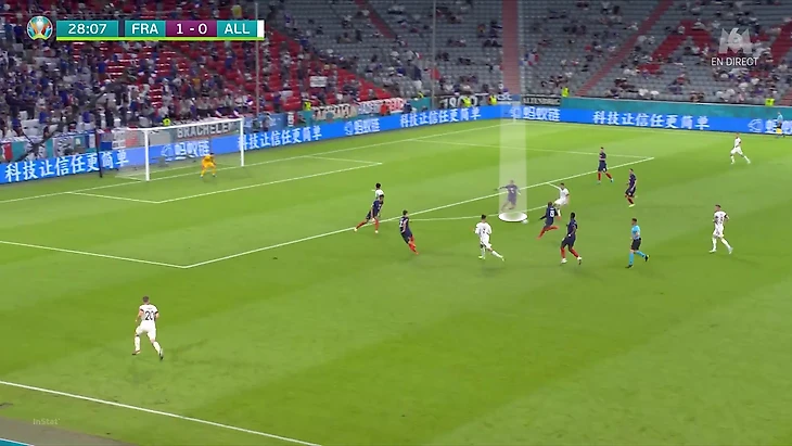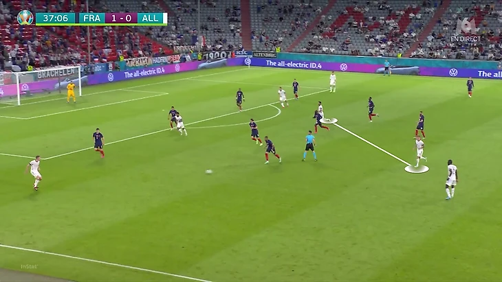 Хавертц, Мюллер и Гнабри пытались проверять Францию – поочередно оттягивались в опорную зону для приема мяча. Именно принимать там получалось, а вот доводить до остроты было сложнее. Причина – агрессивные выдвижения Рафы Варана и Преснеля Кимпембе: