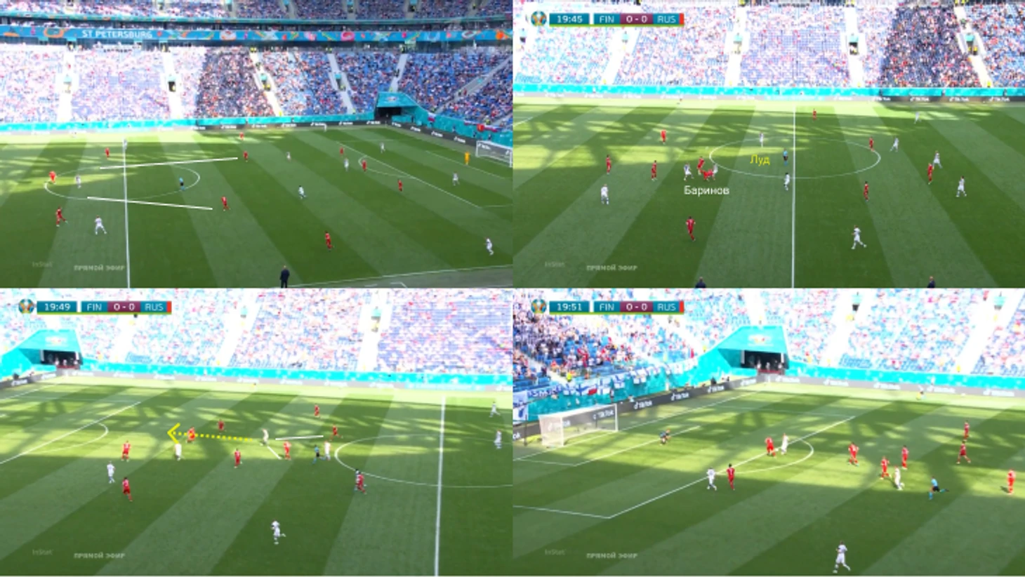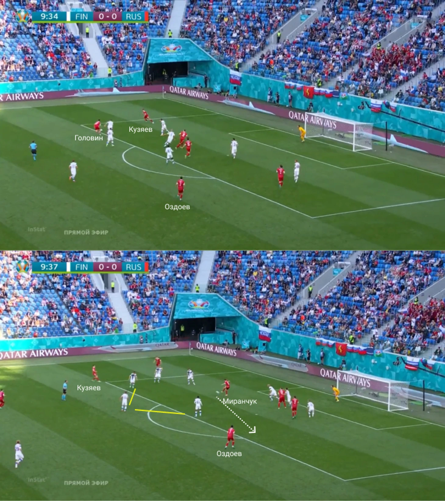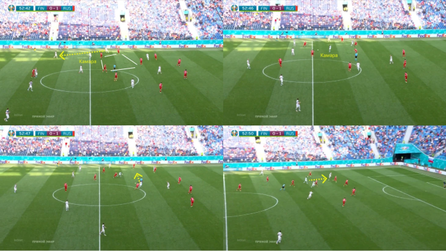 Вторая – асимметричное расположение Головина и Оздоева, связанное с очевидным креном атак на навесы для Дзюбы. Александр часто смещался с левого полуфланга в центр или чуть назад, делая подготовительные движения под забросы (примеры: удар Зобнина с разворота в конце + эпизод с травмой Марио).