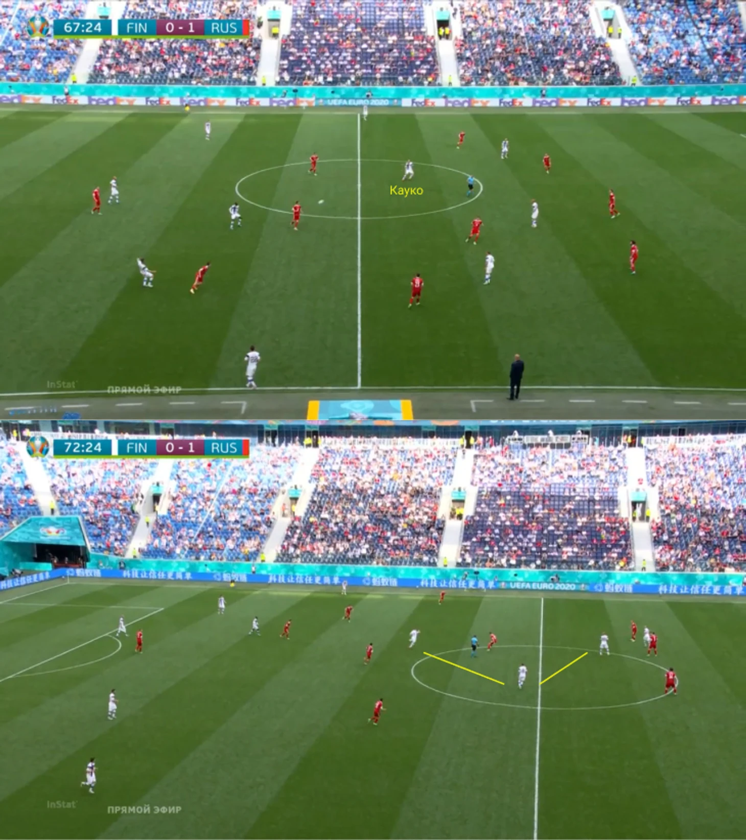 Кроме того, Россия легко допускала переводы с фланга в центр. Вот эпизод, когда Кауко вбегал в привычном для финнов стиле – ситуация 2-в-1 против Зобнина. И сразу второй: Россия снова теряет компактность и численно проигрывает в опорной зоне.