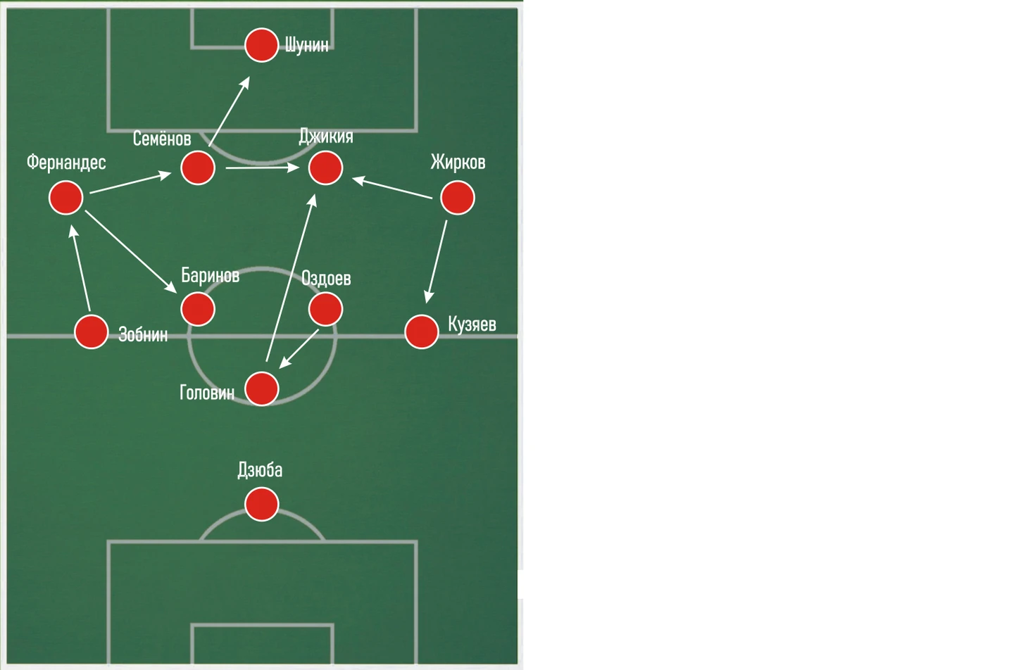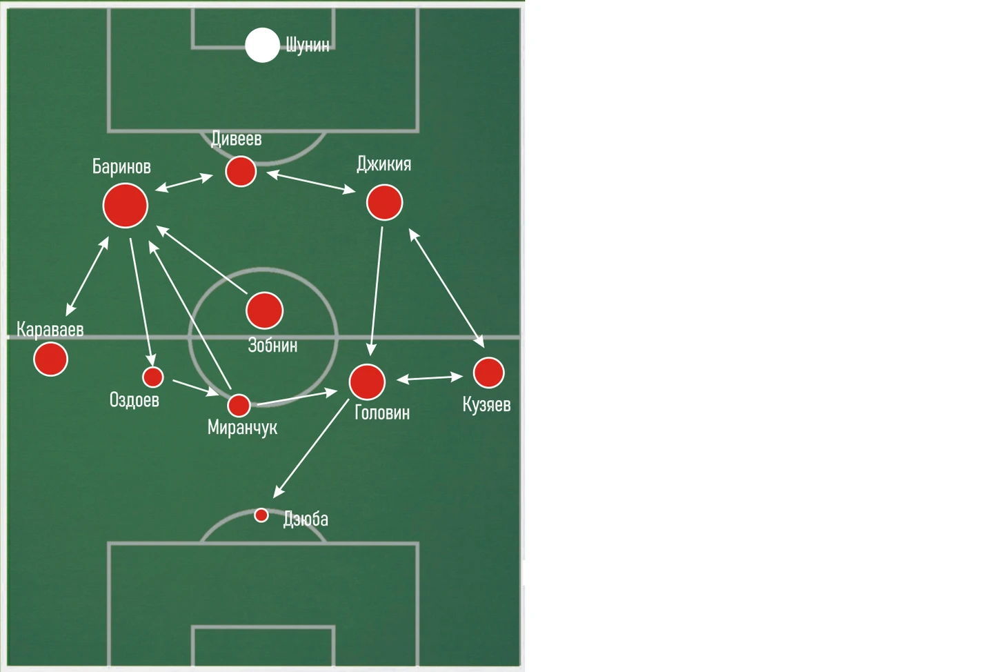 Поскольку передач было уже прилично, можно проследить динамику игры. Мяч вёлся через Баринова, который периодически выдвигался в центр. Любопытно, что далее мяч двигался на противоположный фланг, потому что Головин играл именно там и потому что Оздоев не игрок атаки.