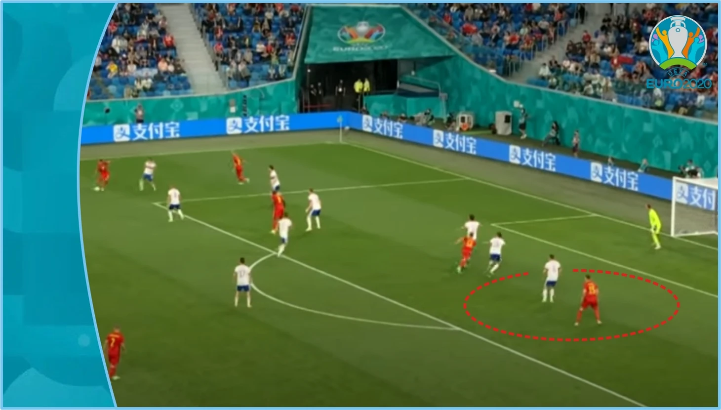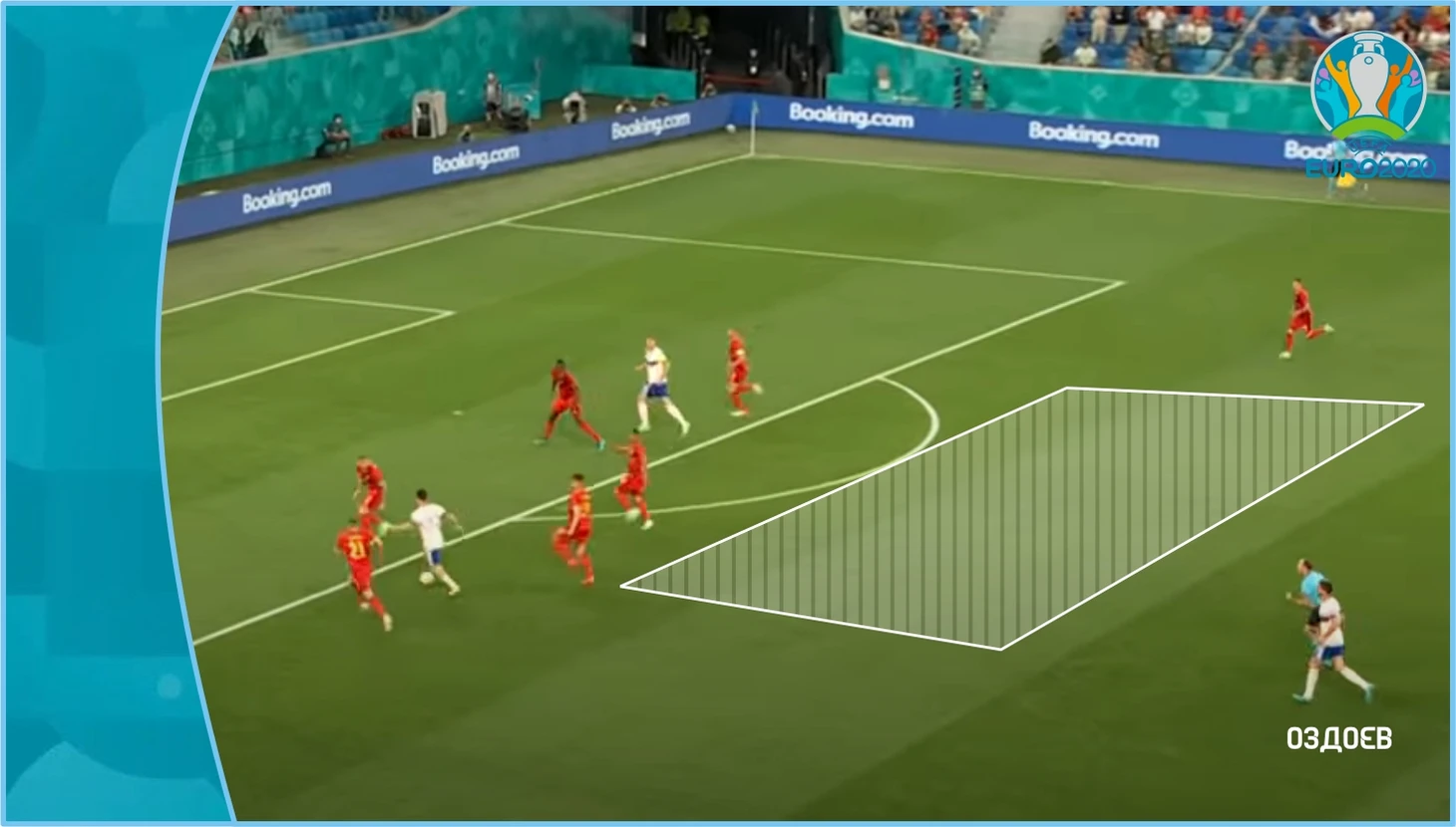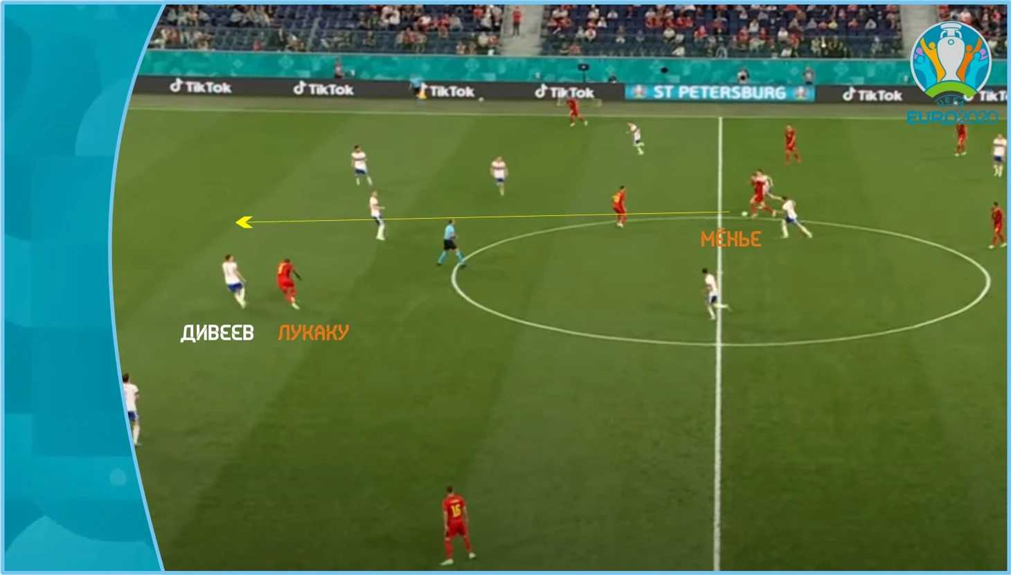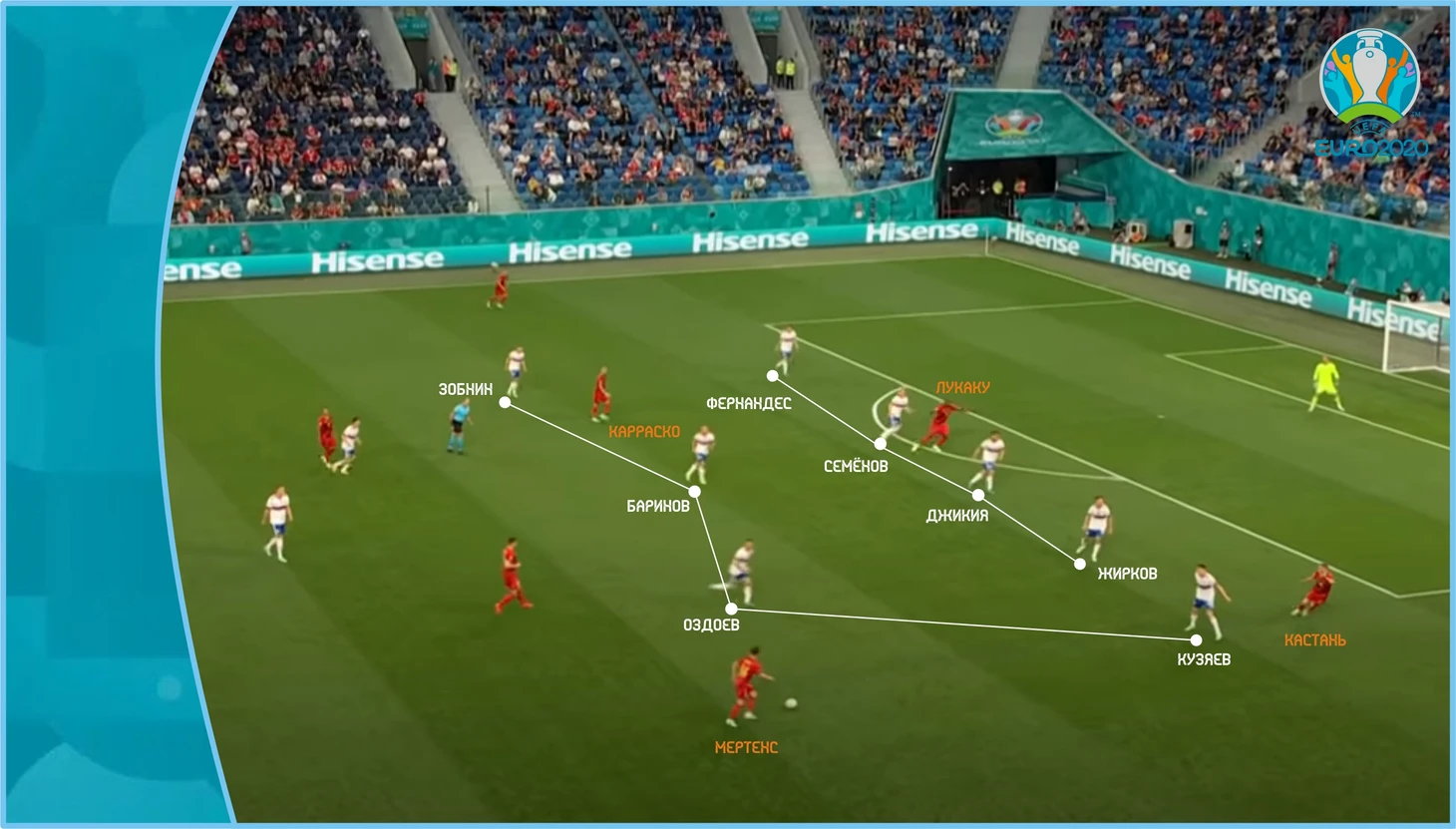 Первый гол приехал сразу. Не сам приехал, а подвёз его Семёнов. Ниже видим расстановку сборной в этот момент. Кастань лёгким движением вперёд отвлёк на себя полузащитника Кузяева, а вот защитник Жирков "своего" Мертенса не взял, так как задача, судя по всему, состояла держать линию до штрафной. Оздоев помешать не успевает, впрочем, не особо и надо - впереди один Лукаку против всё четвёрки - отечественных Портоса, Атоса, Арамиса и д'Артаньяна.