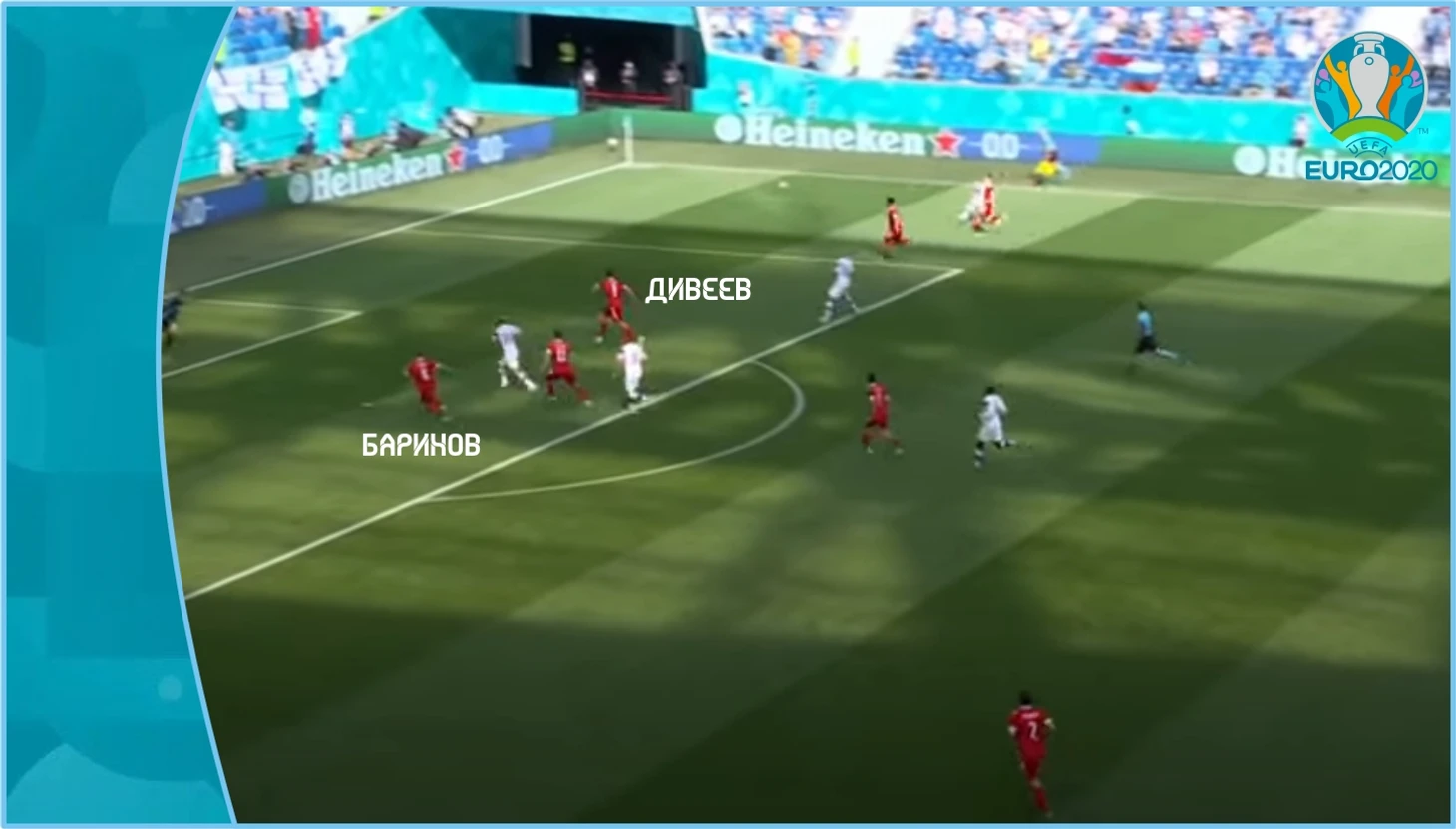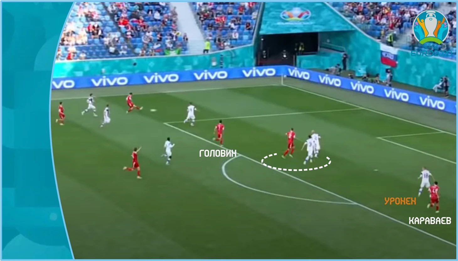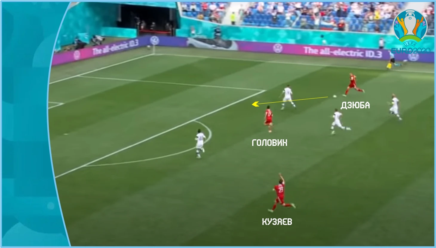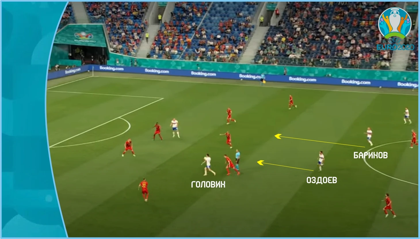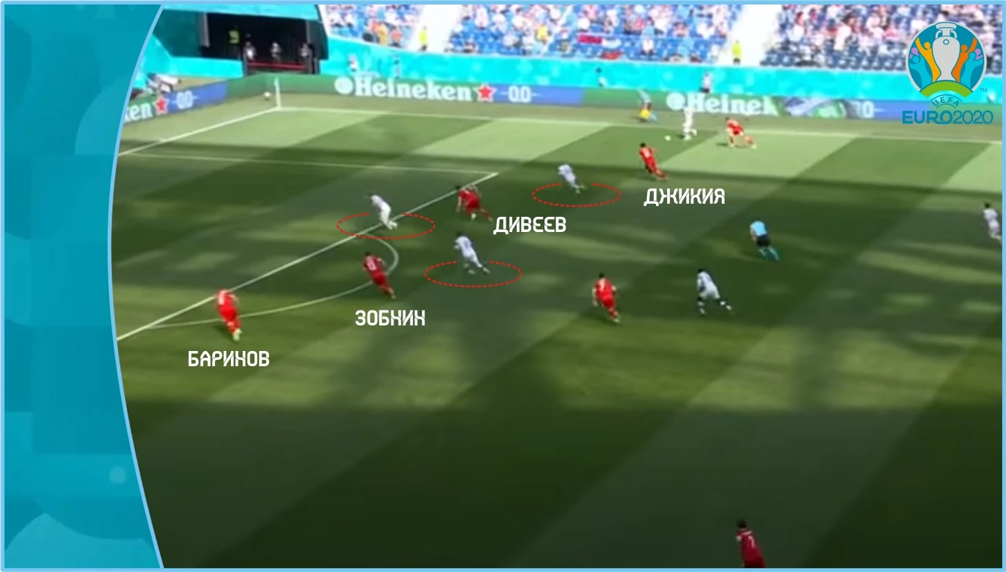Редкая атака россиян. Головин с мячом, Оздоев и Баринов имеют перед собой свободные зоны для помощи атаке. При счёте 0:1, напоминаю.