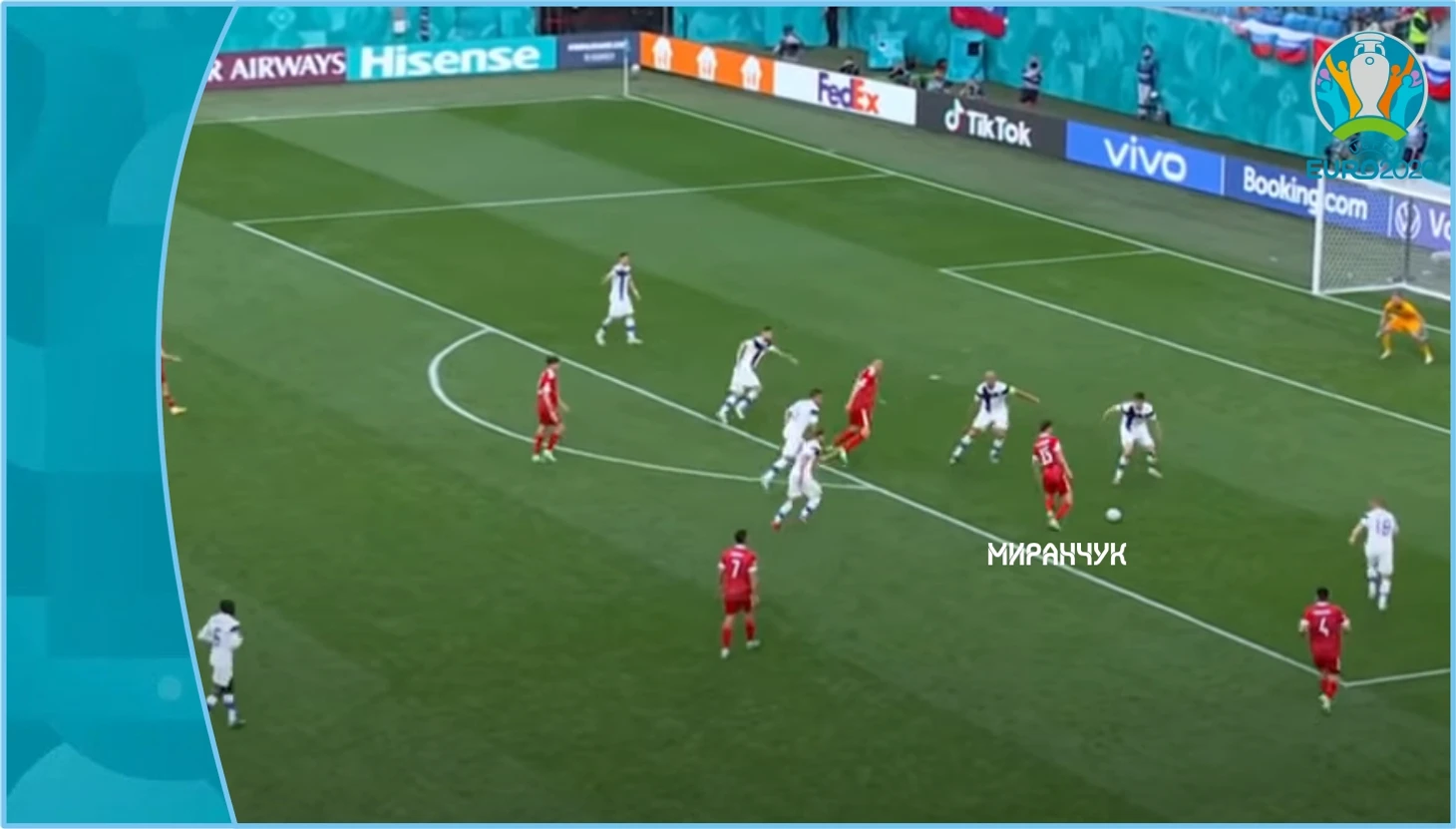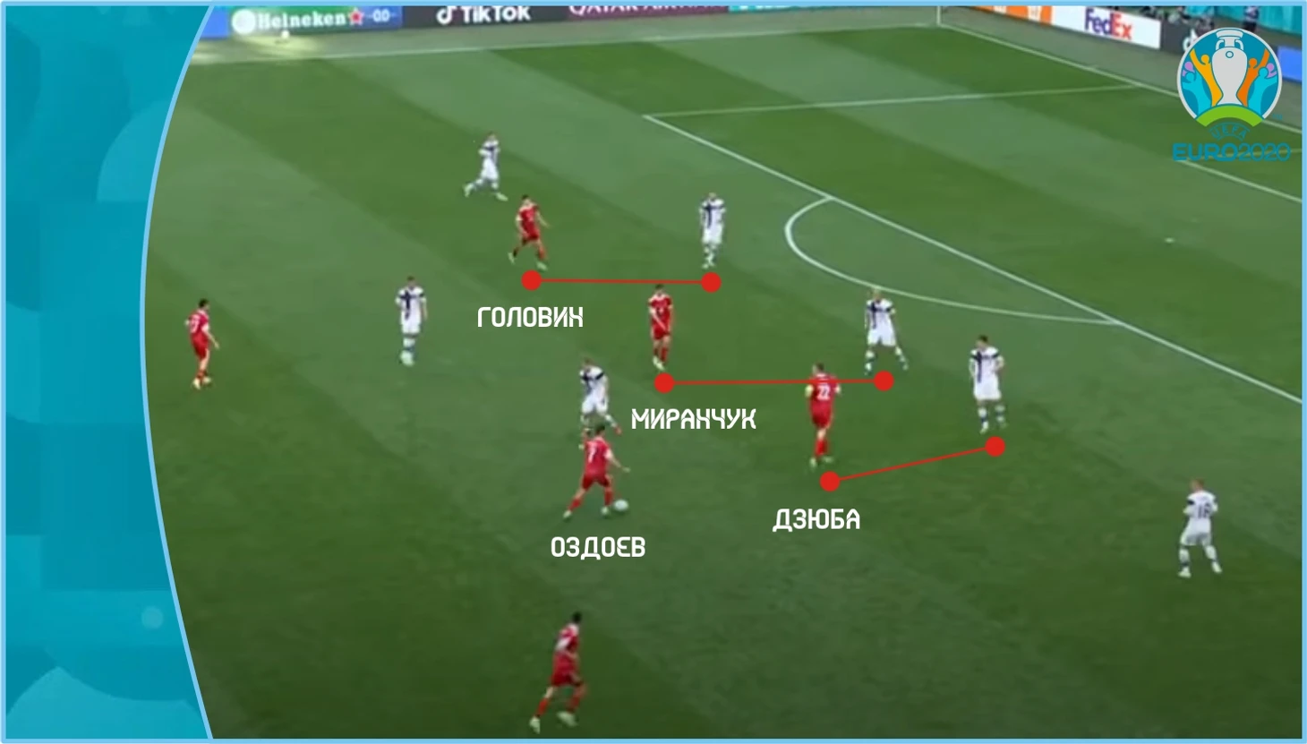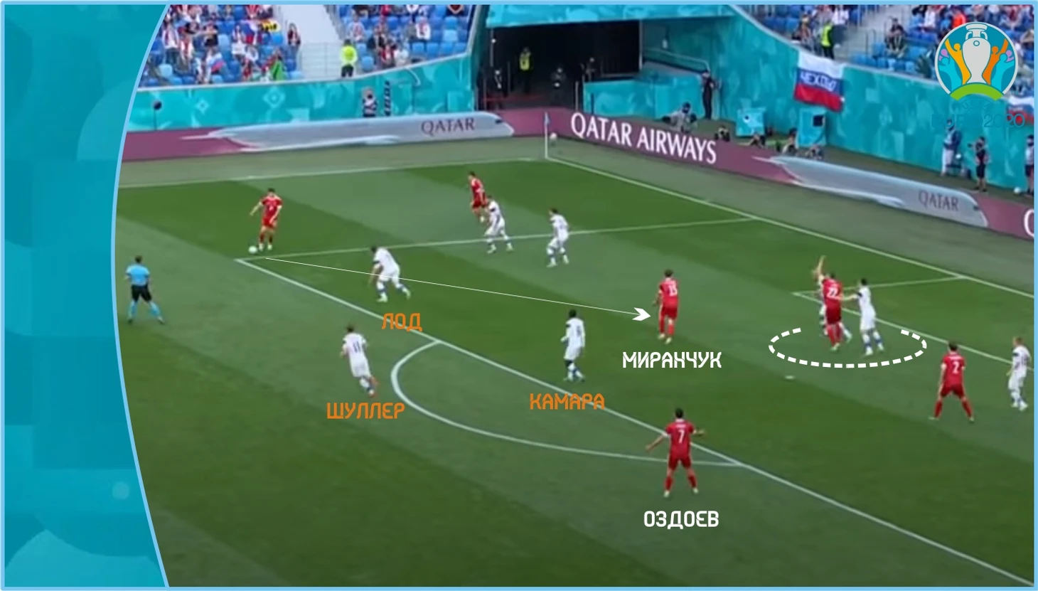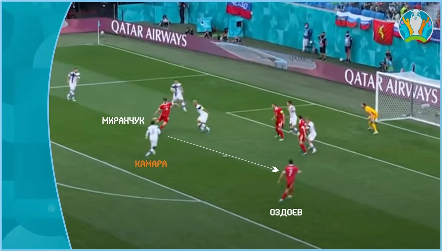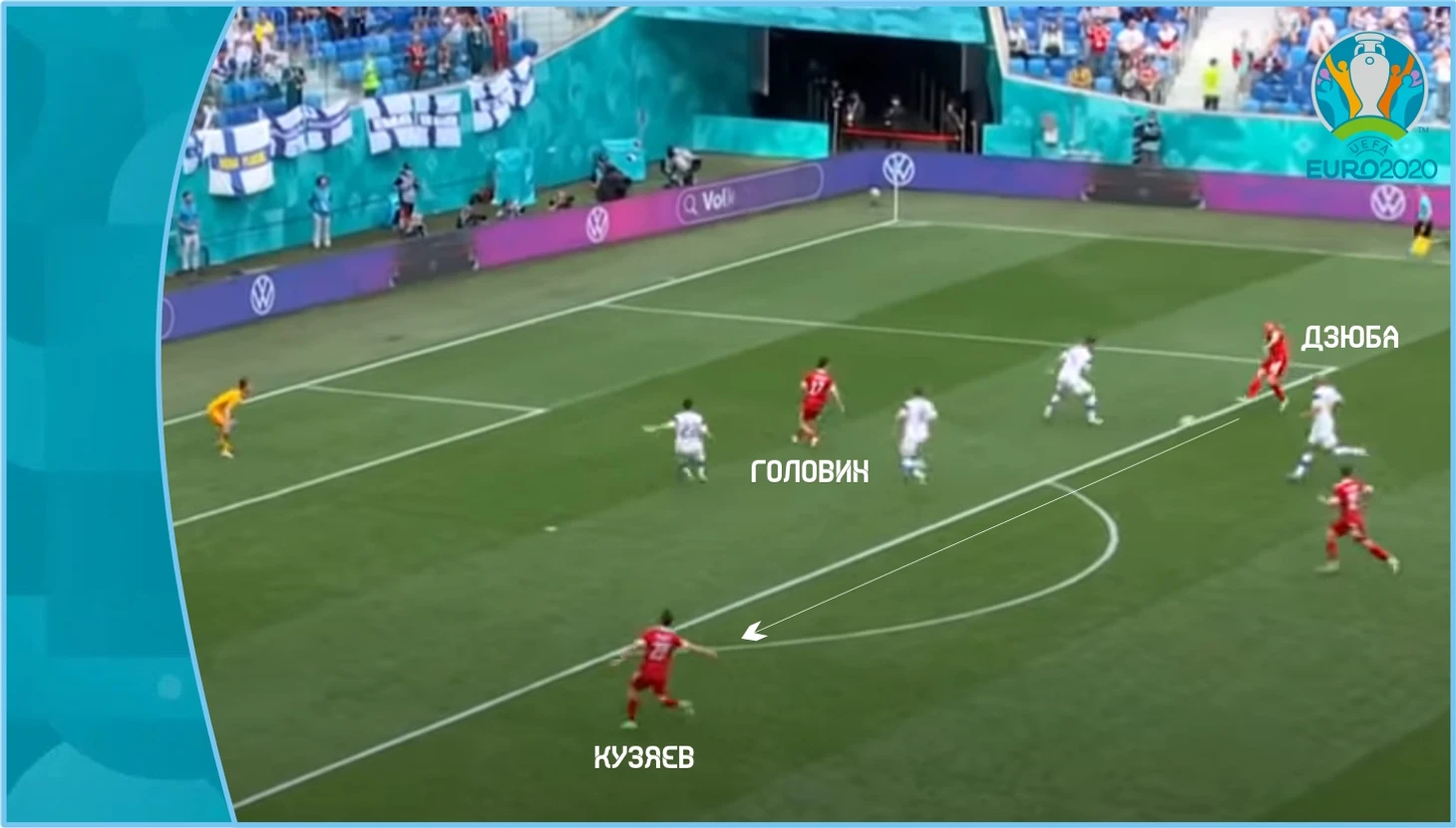 Что мы видим на стоп-кадре? Миранчука держать некому, Оздоев никому не нужен, зато за Дзюбу взялись сразу два защитника. Что делают три центральных полузащитника финнов Лод-Шуллер-Камара? Выполняют установку? По сохранению равносторонней треугольности?