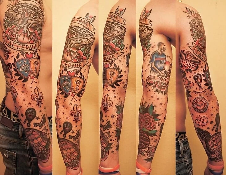 Пожил и в Тюмени, и в Тобольске, и в Геленджике, сейчас – в подмосковном Щелково, работаю барбером и тату-мастером. У меня все татуировки на правой руке посвящены футболу и сборной Франции: на предплечье с внутренней стороны – мяч с розами, с внешней – глобус с надписью Voyage, самолетом, воздушным шаром и кораблем (все во французском триколоре), есть логотип нашего фан-клуба Irresistibles Francais с кубком 2018 года, Зидан в форме-2004 дарит мяч мальчику с надписью Pour toute la vie («На всю жизнь»). На плече – «Стад де Франс», стилизованный под сердце, рядом – бутсы с надписью My way («Мой путь»).