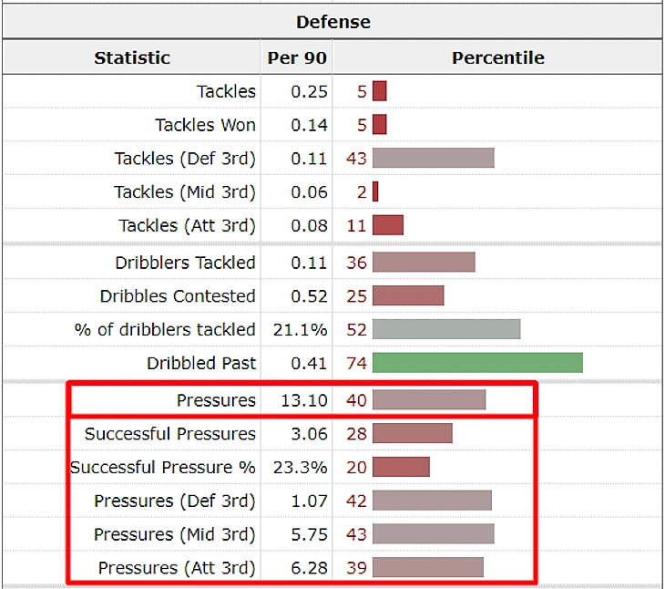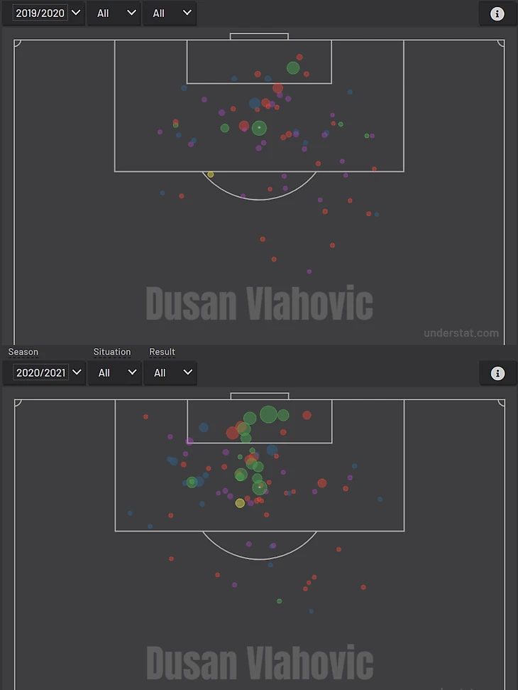 Меньше стало ударов и в целом (2,62 против 3,84 на 90 минут); средняя дистанция удара также стала меньше (14 метров против 15,3). Зато больше стало среднее качество удара по non-penalty xG: с 0,11 оно выросло до 0,16.
