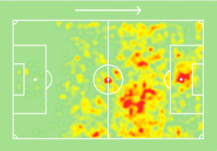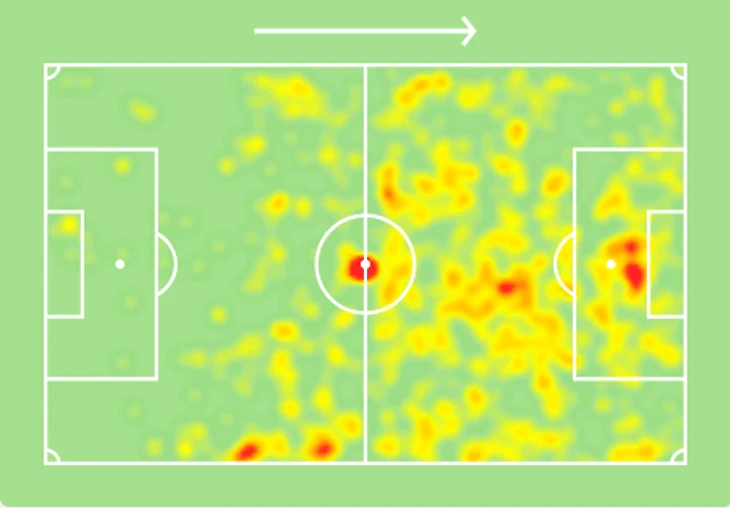 Карта ударов демонстрирует изменения явным образом: больше ударов из вратарской, меньше – из-за пределов штрафной (14,5% против 26,1% ранее), больше ударов из штрафной ближе к центральной оси и меньше заблокированных ударов.