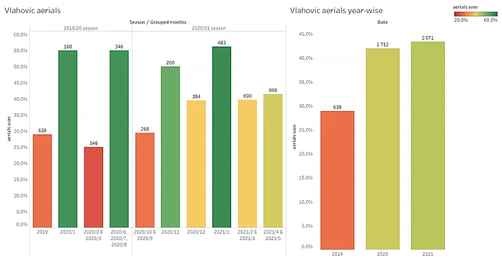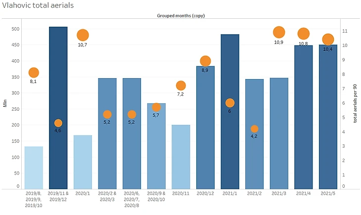 График говорит о том, что по ходу карьеры чем больше времени в старте проводил Влахович, тем чаще он начинал вступать в верховые единоборства. Спад в январе-феврале 2021 года не должен смущать – он связан с попытками Пранделли разыгрывать мяч от ворот более коротко, от которых в итоге тренер отказался.