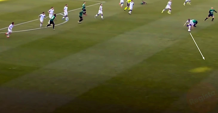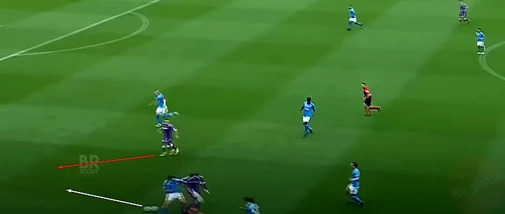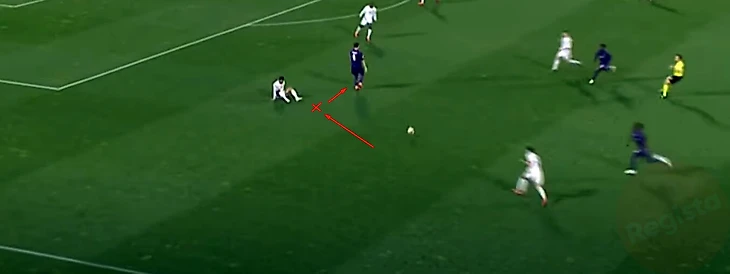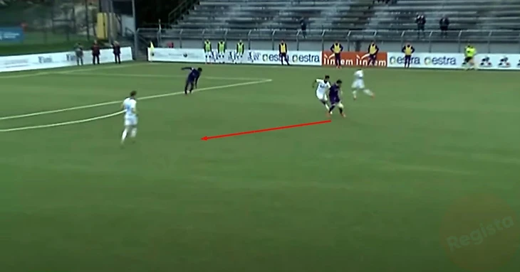 Что касается работы в обороне, то здесь нападающий достаточно инертен. Влаховичу не свойственна монотонная беговая работа при игре без мяча – форвард скорее нацелен на одиночные рывки для создания давления на защитника и при неудачном исходе стремится занять более удобную позицию для выхода на свободное пространство при обратном переходе владения: