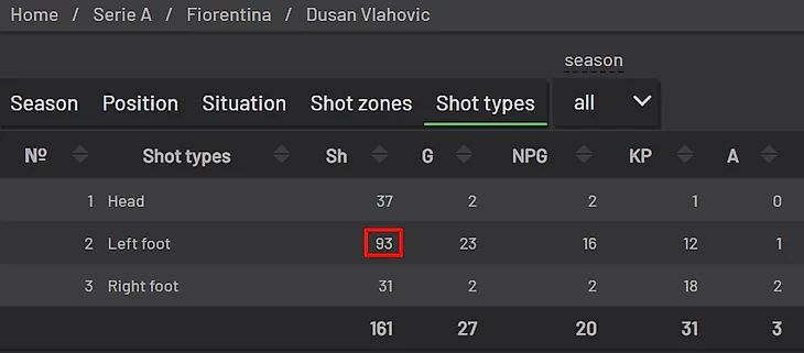 Влахович – левша, и большинство своих ударов (93 из 161, 57,7%) он наносит левой ногой.