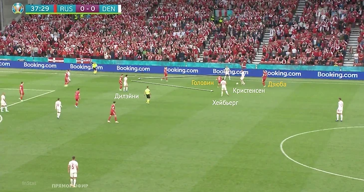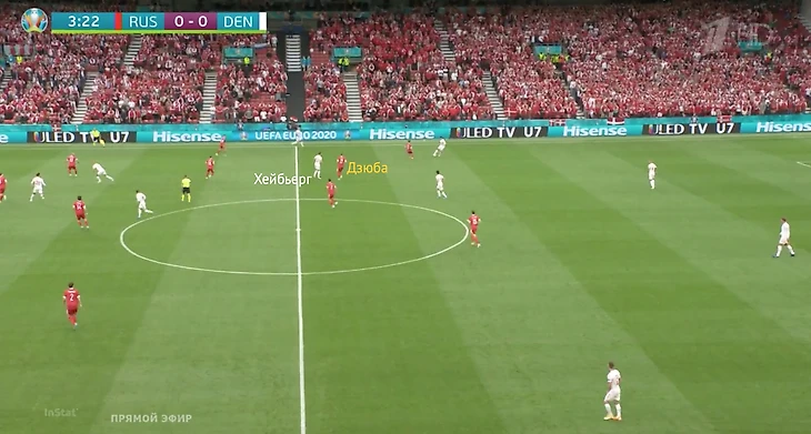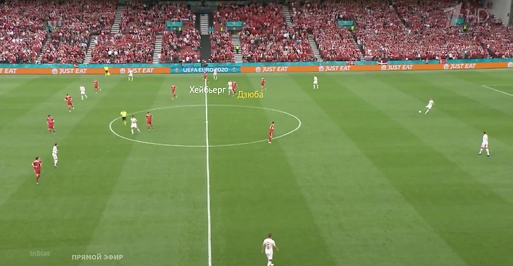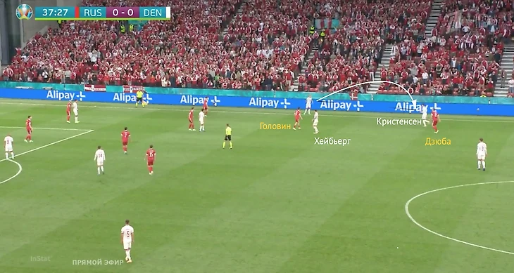 Хейбьерг – автор голевой передачи на первый гол Дании, логично искать в нем след Дзюбы. Гол пришел после аута Васса (и Мэле случился только после перерыва) – изначально по Хейбьергу играл Головин, а Дзюба – по Кристенсену. Тут Артем сразу явно не доиграл.