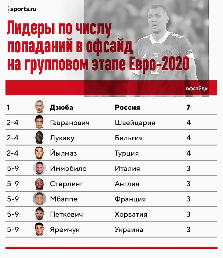 Вероятно, главная претензия к Дзюбе на Евро – отсутствие концентрации в нескольких эпизодах. Во-первых, Артем – явный лидер турнира по числу попаданий в офсайд. Нахождение в топе Мбаппе, Стерлинга, Яремчука, Лукаку – нормальная история, но Дзюба, заточенный в системе Черчесова в основном под борьбу после длинных передач, занимает первое место из-за своих ошибок.