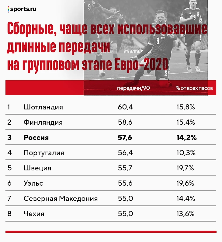В итоге Россия использовала длинные передачи чуть не больше всех на Евро.
