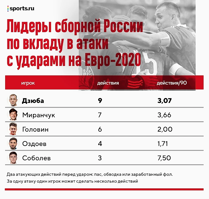 Несмотря на огромный объем работы за штрафной, Дзюба стал лучшим у России по участию в атаках с ударами. Его преимущество перед Миранчуком и Головиным не поражает, само нахождение главного нападающего на первом месте нормально, но и никакого провала нет.