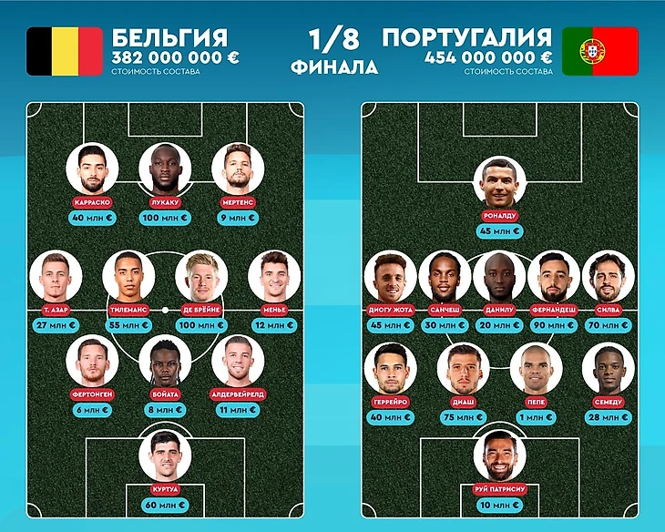 Про ударное поколение бельгийцев начали говорить еще раньше,но до ЧМ-2018,им не удавалось как следует пошуметь на крупных турнирах.Тут же, все сошлось воедино,новый тренер Роберто Мартинес,и большое количество мастеровитых игроков,находившихся на пике формы.Забыть победу над Бразилией невозможно,это был очень яркий матч.В итоге бельгийцы ,были остановлены только в полуфинале,будущими чемпионами французами.А Эден Азар и Кевин де Брюйне,стали одними из главных звезд всего турнира.Что естественно добавило опыта и уверенности этой команде.Вот такие две команды, свел жребий в одной восьмой чемпионата европы по футболу.