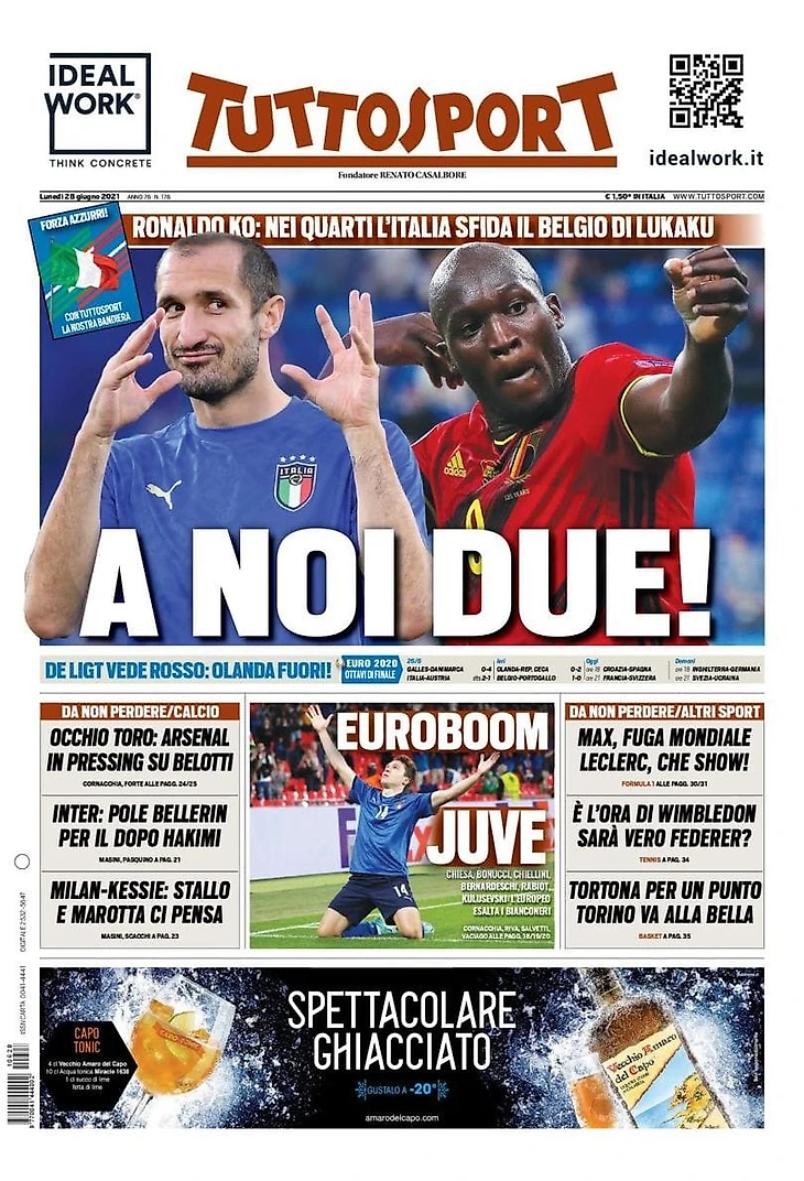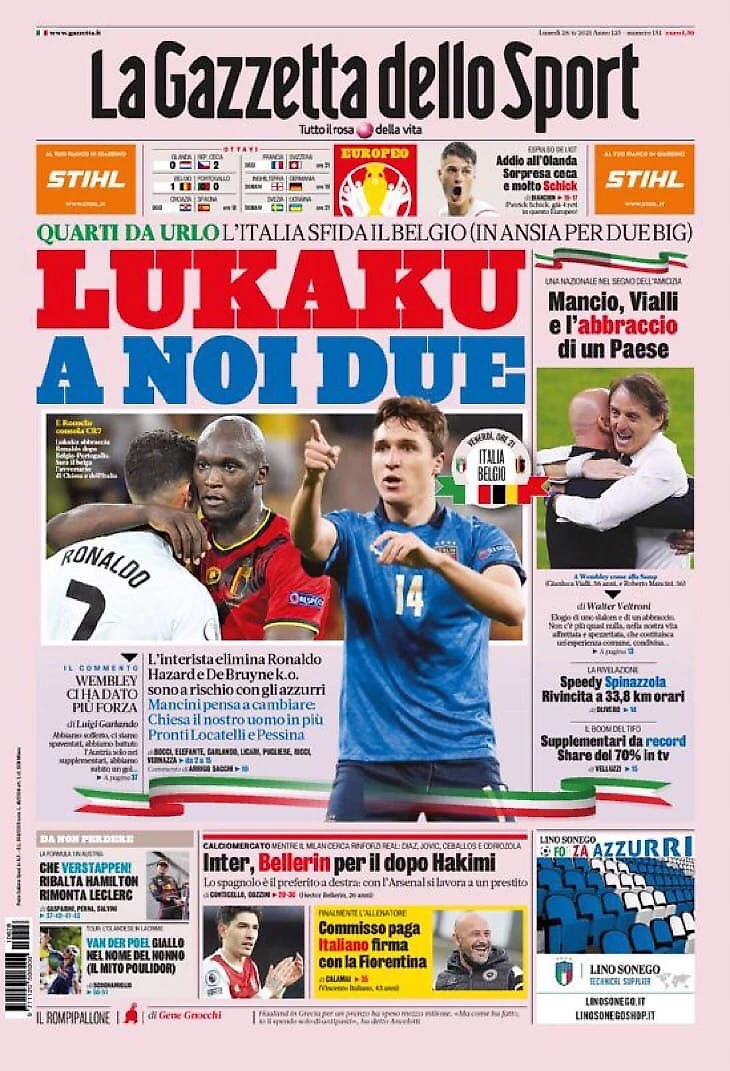 Четвертьфинал до крика. Италия сразится с Бельгией (в тревоге из-за двух звёзд). Интериста выбил Роналду, Азар и Де Брюйне травмировались и рискуют пропустить матч с Адзурри. Манчини думает об изменениях: Кьеза наш дополнительный игрок. Готовы Локателли и Пессина.