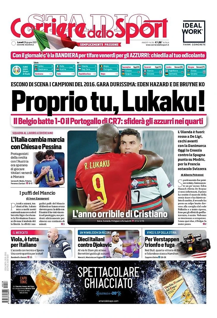 Вылет португальцев и предстоящий четвертьфинал Италия-Бельгия, а также другие матчи Евро-2020 – в утреннем обзоре заголовков итальянских спортивных изданий в блоге «В гостях у Кальчо».