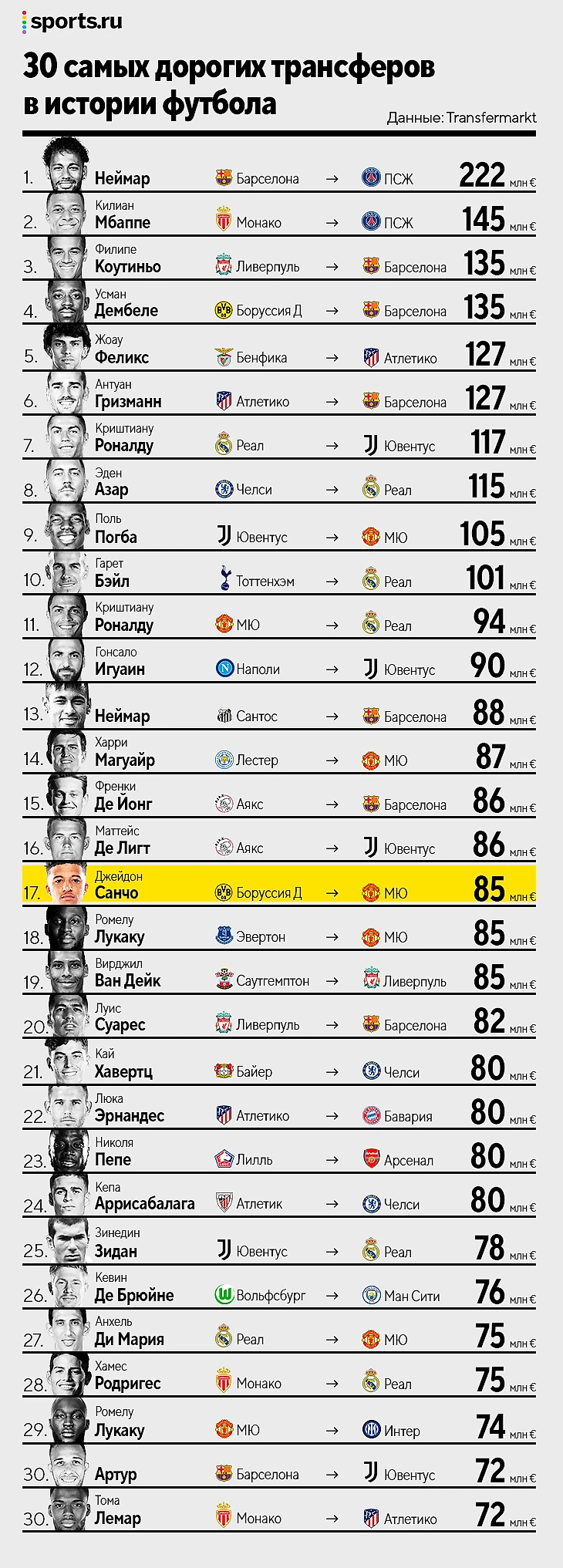 • «Манчестер Юнайтед» теперь вторые по числу покупок из топ-30 – у них с «Реалом» по 5 приобретений. Впереди только «Барселона», которая выложила большие деньги за Коутиньо, Дембеле, Гризманна, Неймара, Френки Де Йонга и Луиса Суареса.