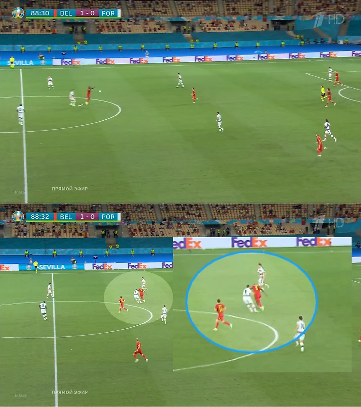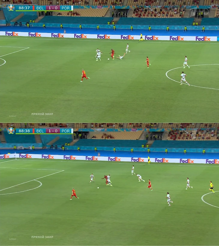 Лукаку весь второй тайм 1/8 финала терзал Португалию борьбой и был единственным шансом Бельгии на гол, но принимал неудачные финальные решения. Хотя здесь он разобрался четко: сначала оторвался от Диаша и успешно обработал мяч. В следующей фазе переложил мяч под удобную правую ногу, помог себе руками и сделал рывок.