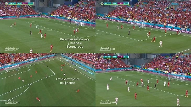В первом случае он ускользнул от Вестергора и Кьера, когда забивал Торган Азар. А во время решающей атаки расправился с Кьером, на маленьком пространстве обыграл Вестергора и Мэле и тем самым стянул часть датской защиты на фланг. А затем развернул атаку налево и даже успел вернуться в штрафную.