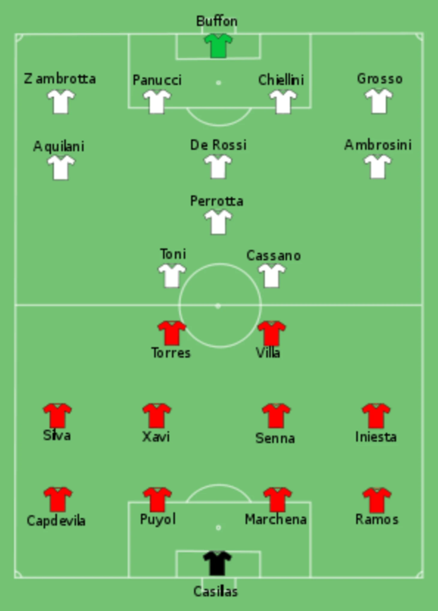 Матч получился напряжённым , дело дошло до пенальти , где наметилась дуэль Буффон - Касильяс , в которой испанский вратарь , сделав 2 сэйва , вывел свою сборную в полуфинал . Это был победный турнир для Испанцев и начало большого пути "Красной фурии"